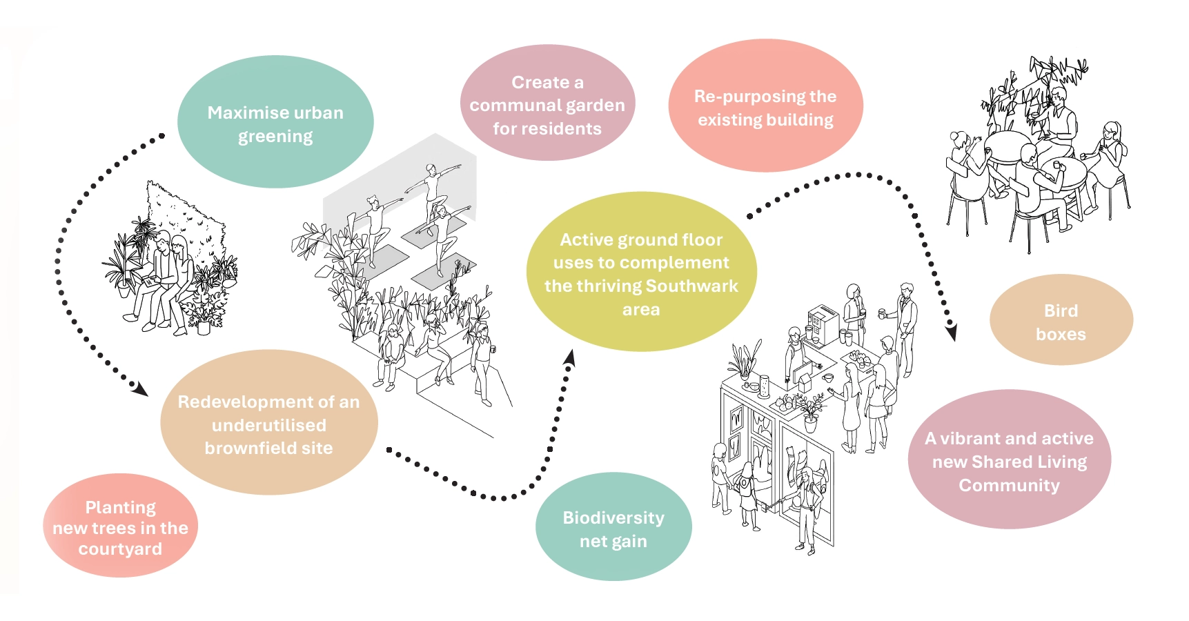 We believe that there is an opportunity for the building to be reimagined as new homes and make a positive contribution to the area and the local community. Our vision is to create a vibrant, sustainable place where residents and the public can thrive, fostering a flourishing community. We plan to retain as much of the existing structure as possible, retaining circa 8,675 tonnes of concrete, which will save approximately 1,950 tonnes of CO². Furthermore, the impact on neighbours during construction is reduced in comparison to new build construction.